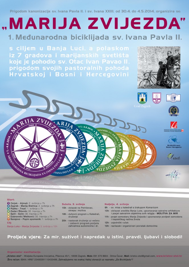 Kristov Stol - Misijska Europska Inicijativa, uz papinu kanonizaciju, od 30. travnja do 1. svibnja, organizira biciklijadu Marija Zvijezda - Međunarodna biciklijada sv. Ivana Pavla II, s ciljem u Banja Luci iz 7 smjerova, gradova i Marijanskih svetišta koja je pohodio sv. Ivan Pavao II, prigodom svojih 5 pastoralnih pohoda Hrvatskoj i Bosni i Hercegovini... Iz svakog smjera kreće 5 ili više biciklista, kako bi se u subotu, 3. svibnja njih 40-ak okupilo u Banja Luci, na Petrićevcu. Geslo biciklijade je: Proljeće vjere - Za mir, suživot i napredak u istini, pravdi, ljubavi i slobodi. Projekt je podržao biskup Komarica, Međureligijsko vijeće BiH u Sarajevu, Vojni ordinarijat RH, IIPT - Internacionalni Institut za Promidžbu Mira Kroz Turizam, Hrvatski biciklistički savez, Biciklistički savez Bosne i Hercegovine i dr.