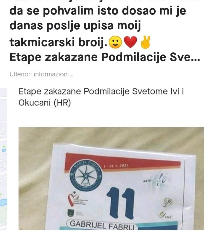 Povodom 7.Marija Zvijezda(virtualno 1-31.5.2021.)biciklijade prihvatio sam sudjelovanje u virtualnoj biciklijadi od Svetišta Majke Božje Trsatske do kapelice Bl.Alojzija Stepinca u Procama-župa Ogulin a po dogovoru sa gđicom.Drina Čavar-predsjednica udruge Kristov Stol.Blagoslov je udijelio gvardijan Svetišta.Logistiku je osigurao gosp.Zvonko Bartolović.
