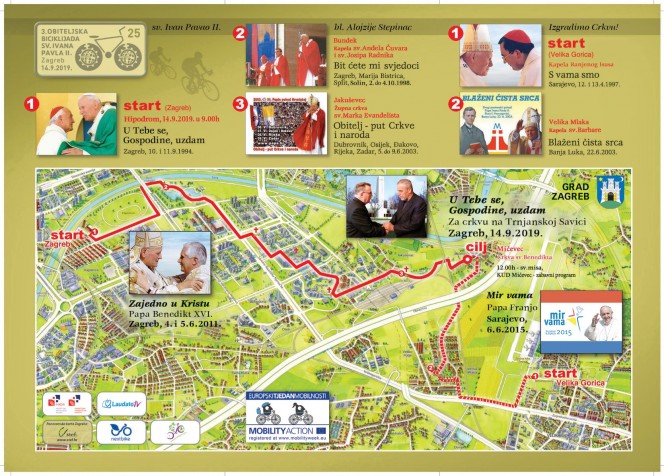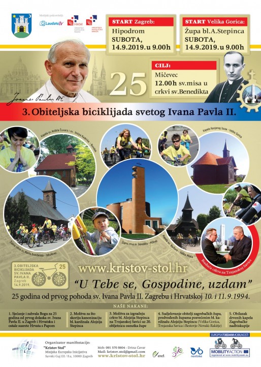 organizira 3. Zagrebačku Obiteljsku biciklijadu sv. Ivana Pavla II. u subotu 14. rujna 2019., u 9h, polazeći sa Zagrebačkog hipodroma na kojem se i odvio taj povijesni velebni susret Hrvata s Papom, uz posjet i molitvu kod drvenih kapela Zagrebačke nadbiskupije - na Bundeku i Jakuševcu, preko novozagrebačkih župa svetih Evanđelista, sa ciljem u crkvi sv. Benedikta u Mičevcu, gdje će se u 12h služiti sv. misa zahvalnica, nakon kojega slijedi kratki duhovno - zabavni program u suradnji sa KUD-om Mičevec.