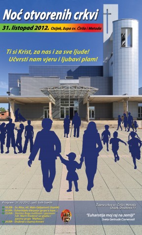 "Uoči svetkovine Svih Svetih, Udruga Misijska Europska Katolička Inicijativa "Kristov stol" iz Zagreba i ove godine organizira diljem Hrvatske u srijedu, 31. listopada navečer «Noć otvorenih crkvi». Ovo je već treća godina za redom da se u Hrvatskoj ovako nešto hvale vrijedno organizira. Do sada je najbolje organizirano bilo u Zagrebu, Osijeku i Splitu. Noć otvorenih crkvi, s 31. listopada na 1. studenoga planira se da vrata katedrala i drugih crkvi koje se žele priključiti, uz prijave organizatoru, ostanu otvorena barem do ponoći,a u njima će biti određeni prostori za duhovno i kulturno razmišljanje. Inicijativom se želi očitovati da su kultura i duhovnost u Europi izvor društvenog života, te vratiti puninu kršćanskog smisla noći uoči Svih Svetih. Pozivaju se i ostale crkve i katedrale u svim gradovima i mjestima da ove večeri otvore svoja vrata, te da se prethodno najave Udruzi Kristov Stol u Zagrebu koja je pokretač ove akcije. Više informacija na mrežnoj stranici Udruge kristov-stol.hr. (kta/f.p.)"