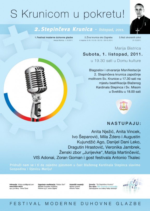 Kristov Stol - Misijska Europska Inicijativa poziva Vas na 2. Stepinčevu Krunicu - Festival moderne duhovne glazbe, u Mariji Bistrici, u subotu, 1. listopada 2011, u 19.30h u Domu Kulture Marija Bistrica, u spomen na Stepinčevu beatifikaciju 3.10.1998, ulaz je besplatan. Događanje počinje molitvom sv. krunice za Stepinčevu kanonizaciju u 17.30h, te večernjom sv. misom u 18h u Svetištu.